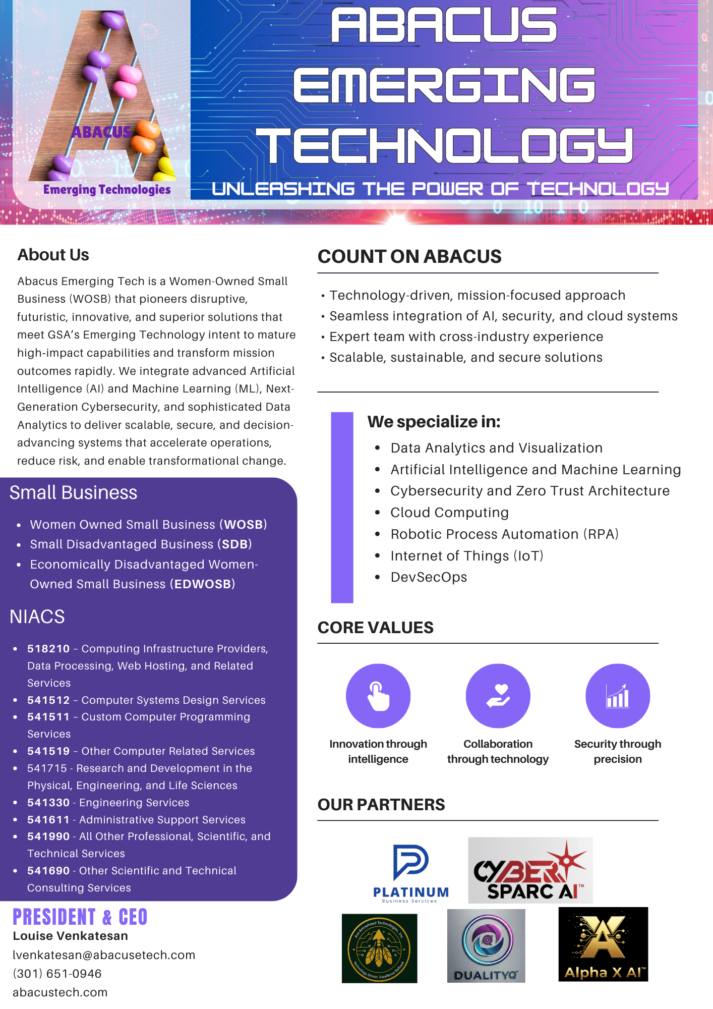 To empower organizations with cutting-edge, intelligent, and secure technology solutions that accelerate digital transformation, strengthen mission resilience, and deliver measurable impact. Abacus Emerging Tech unites innovation, agility, and technical excellence to advance the next generation of AI, cybersecurity, and data-driven systems.